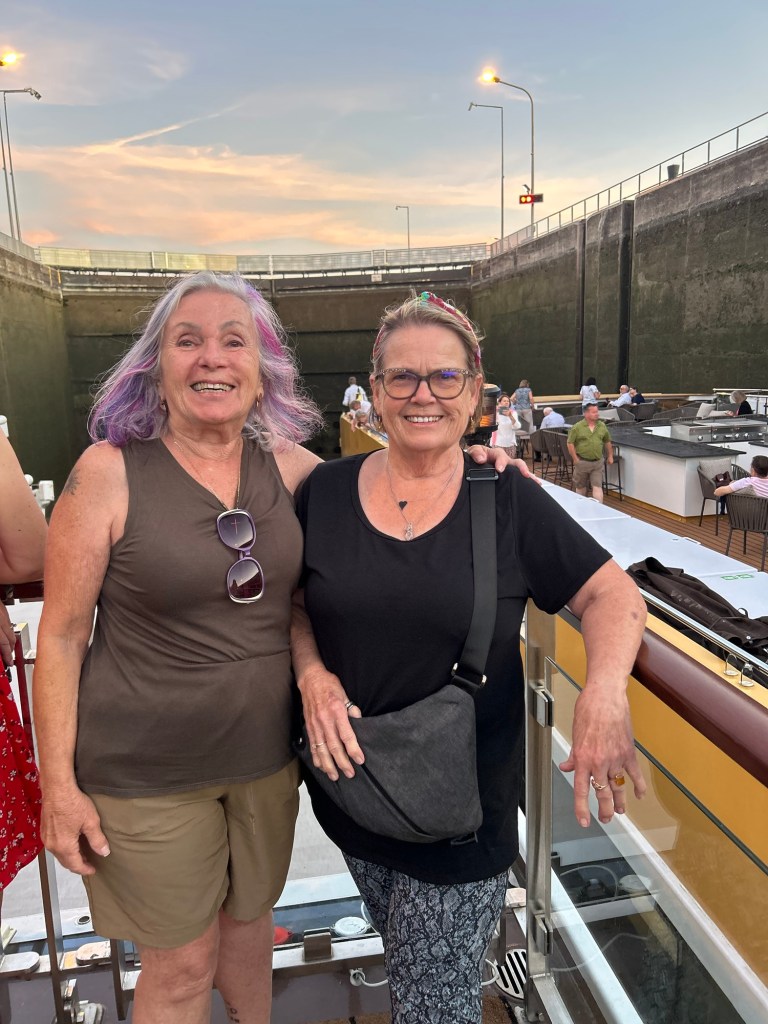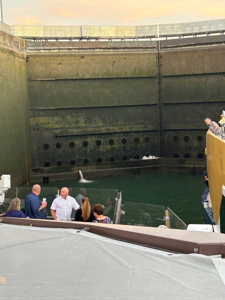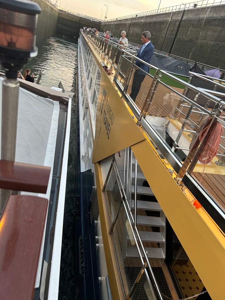 After the 1.5-hour drive back to the ship, we were welcomed with champagne at the crew’s farewell celebration—a lovely gesture and a great way to wind down the day. Dinner followed: a perfectly cooked dorado fish, paired with white wine and a sweet dessert. Meanwhile, the ship quietly moved through yet another canal lock—something that still hasn’t lost its magic.