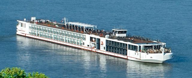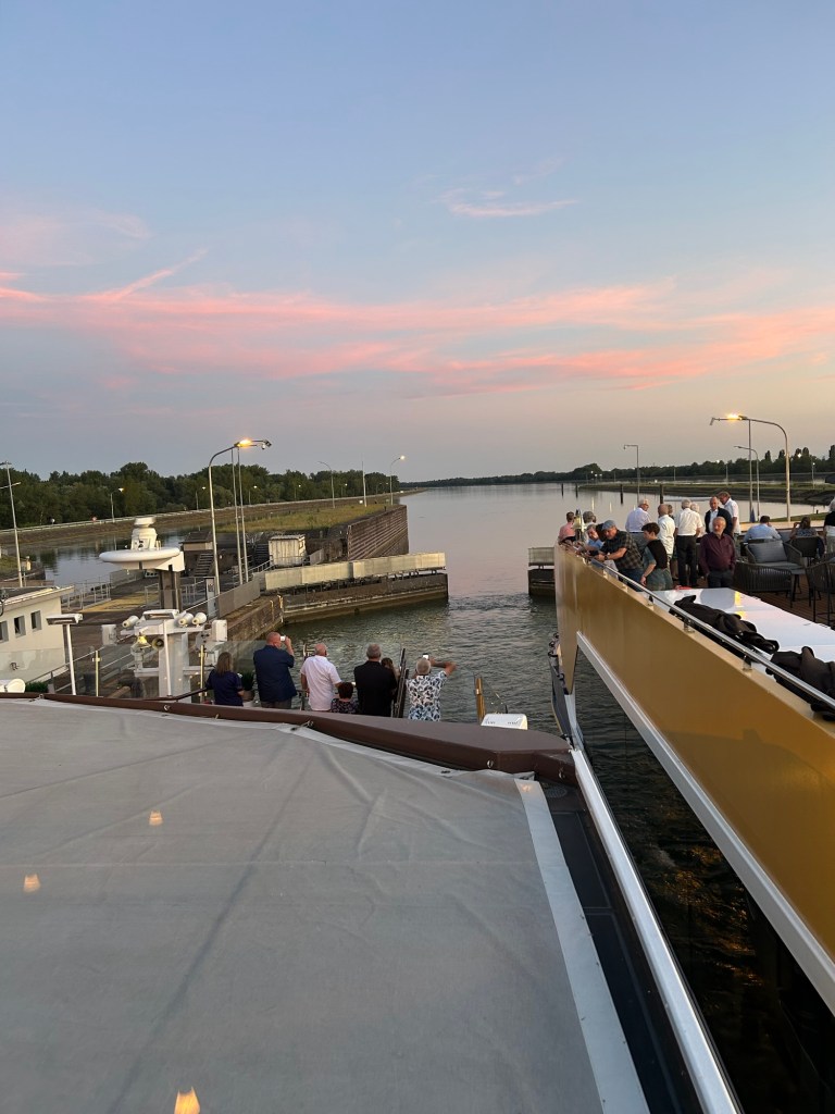 Afterward, needing some fresh air and movement, we headed up to the ship’s terrace to enjoy the view and catch the sunset. The ship had stopped for a while, and another riverboat was docked right beside us. A bridge loomed close ahead.
