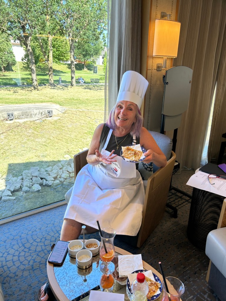 Back to the ship we made a beeline for the bar – because priorities. Music was playing, spirits were high, and we were just starting to swap stories about our day, when, out of nowhere, the chef showed up like a culinary magician. “Who wants to learn how to make German pizza?” He asked. Naturally, I shot my hand up like it was a game show and I actually know the answer. I did not. LOL