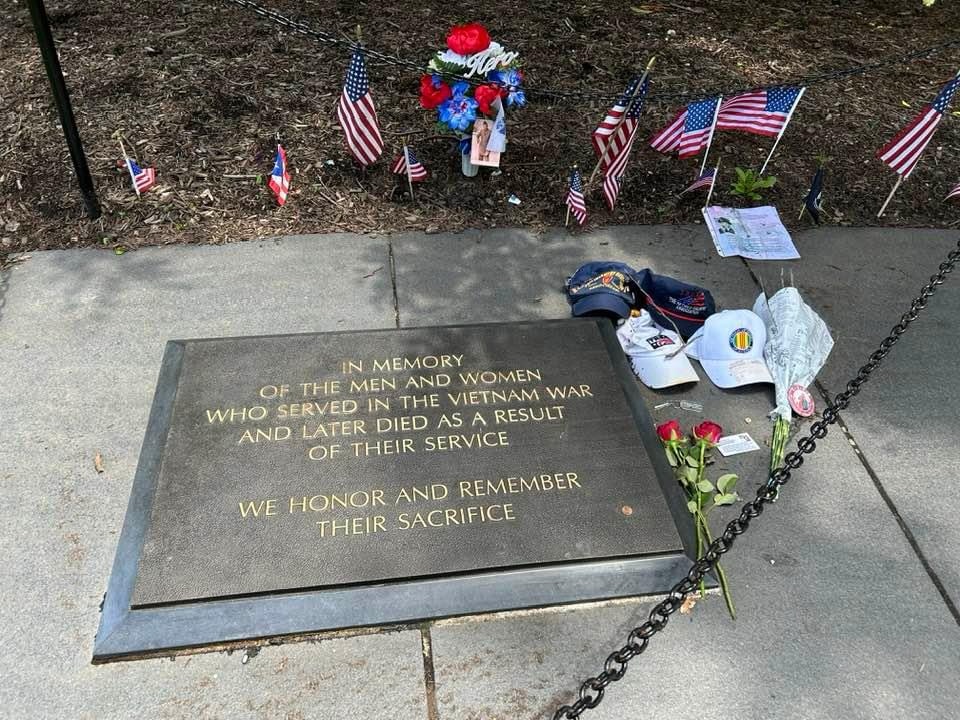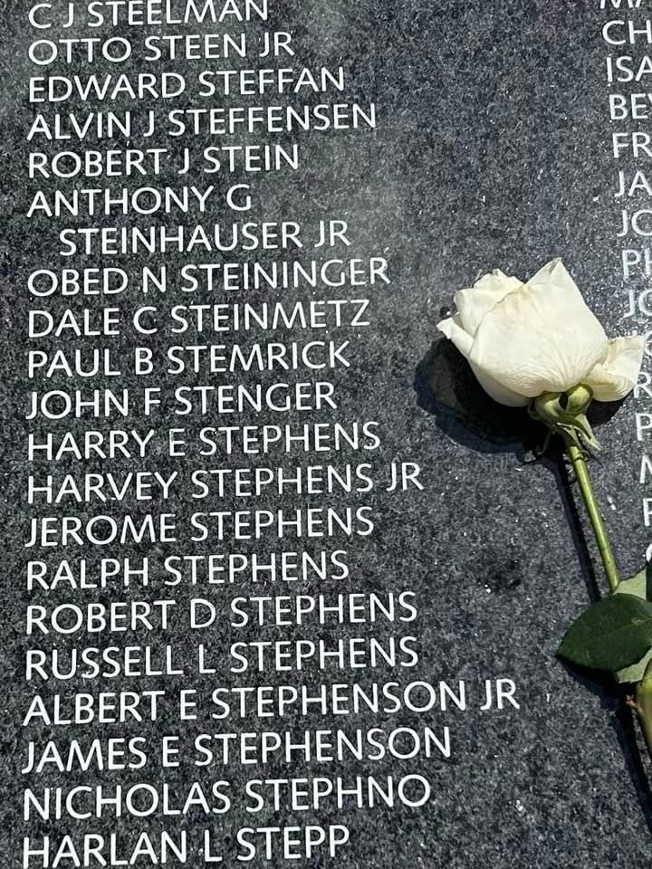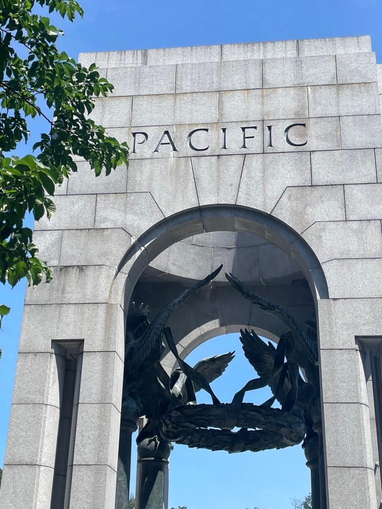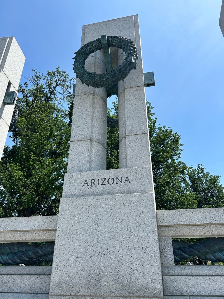 We stop by the National World War II Memorial. Service, Sacrifice, Unity and Victory. Each column has the name of each of the 50 States.