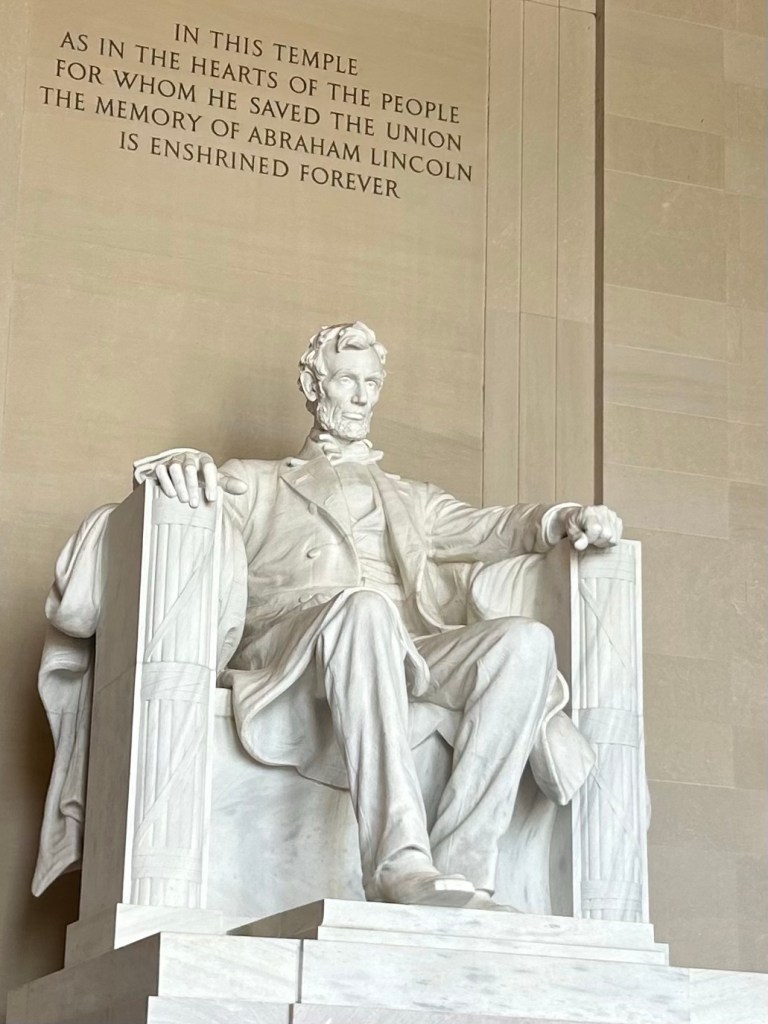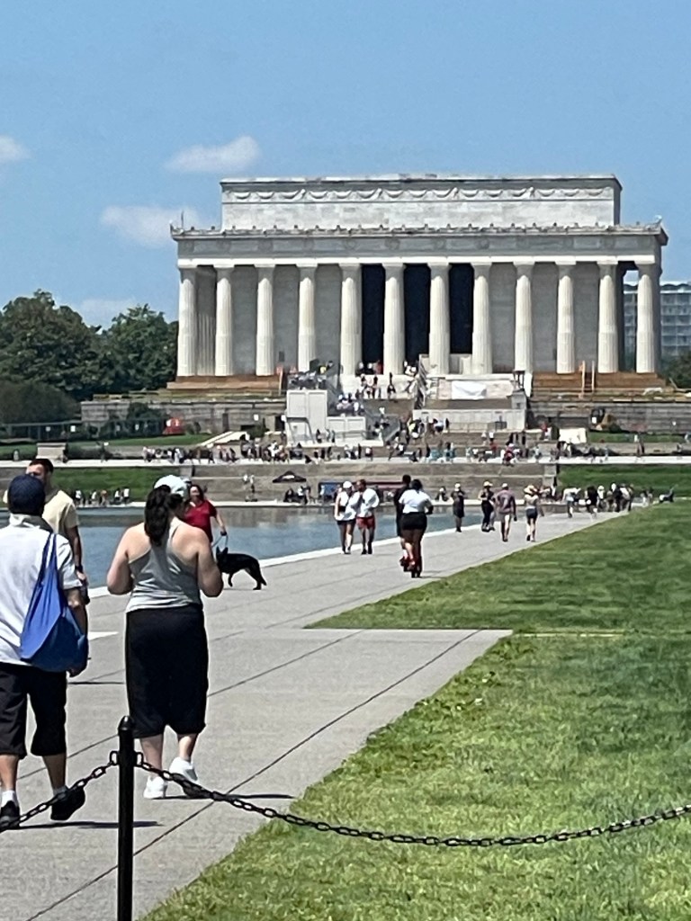 By now 82 degrees, but we found a way to walk on a green beautiful and shady area. We reached the Lincoln Memorial. The 16th President of the United States who guided the contra through civil war and freed millions of enslaved persons.